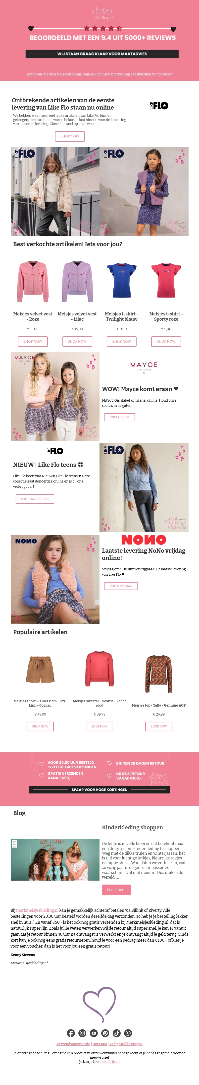 De nieuwste collectie van Like Flo is nu compleet met de ontbrekende artikelen. Ontdek de best verkochte items zoals meisjes velvet vesten en t-shirts in verschillende kleuren. Daarnaast kondigen we de aankomst van Mayce aan en introduceert NoNo haar laatste levering. Shop nu de meest populaire artikelen!