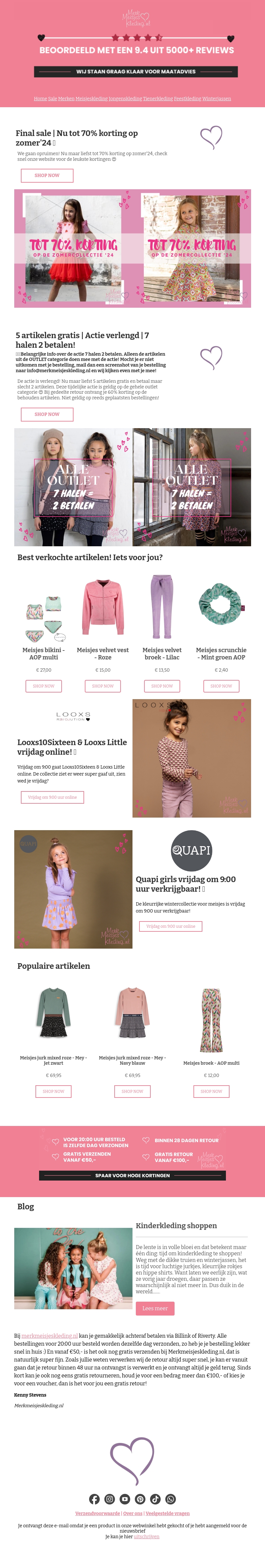 Mis het niet! We bieden tot 70% korting op de zomercollectie '24. Nu verlengd: 5 artikelen halen, 2 betalen! Bekijk onze bestsellers en nieuwe collecties van merken zoals Looxs Little en Quapi. Shop nu en gebruik de nieuwste couponcodes. Gratis retourneren binnen 28 dagen.