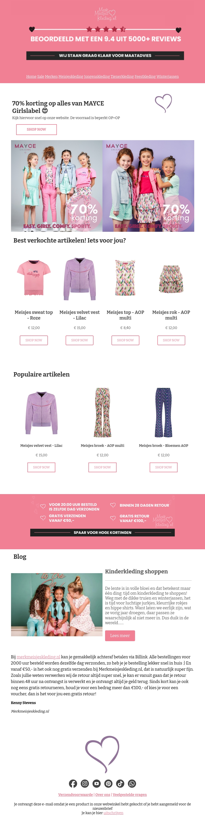 Mis deze geweldige kans niet om te profiteren van 70% korting op alles van MAYCE Girlslabel! Voorraad is beperkt, dus zorg dat je snel langs komt op onze website. Daarnaast hebben we een breed scala aan populaire en best verkochte items. Ook bieden wij gratis verzending vanaf β¬50 en snelle levering. Shop nu en geniet van hoge kortingen!