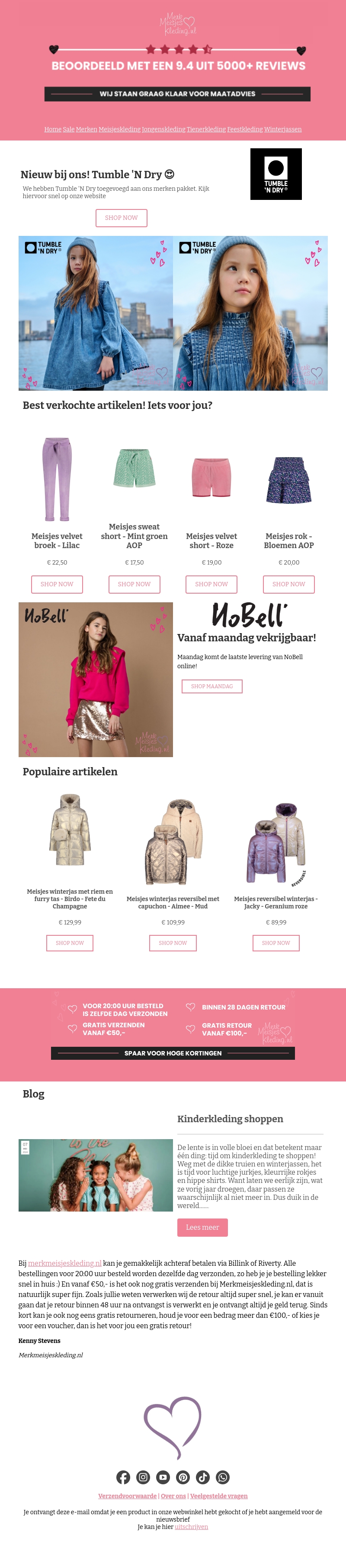 We hebben Tumble 'N Dry toegevoegd aan ons merkenpakket. Bekijk de best verkochte artikelen die perfect zijn voor jouw kleintje, van velvet broeken tot fleece jassen. Mis ook niet de nieuwste levering van NoBell vanaf maandag. Shop nu op onze website!