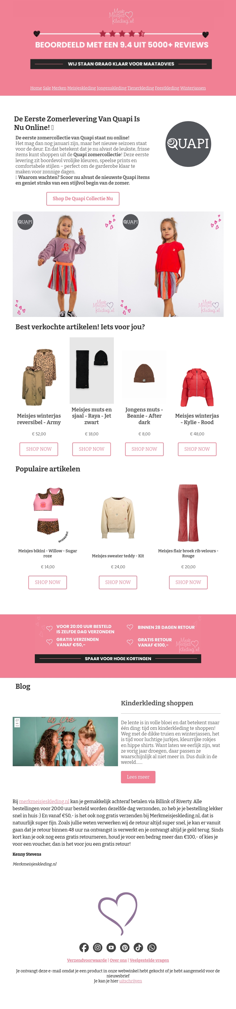 De eerste zomercollectie van Quapi is nu online! Geniet van trendy en kleurrijke stijlen die perfect zijn voor zonnige dagen. Ontdek de nieuwste Quapi-items en bereid je voor op een stijlvolle zomer. Waar wacht je nog op? Shop nu de Quapi collectie en loop voorop met de laatste trends.