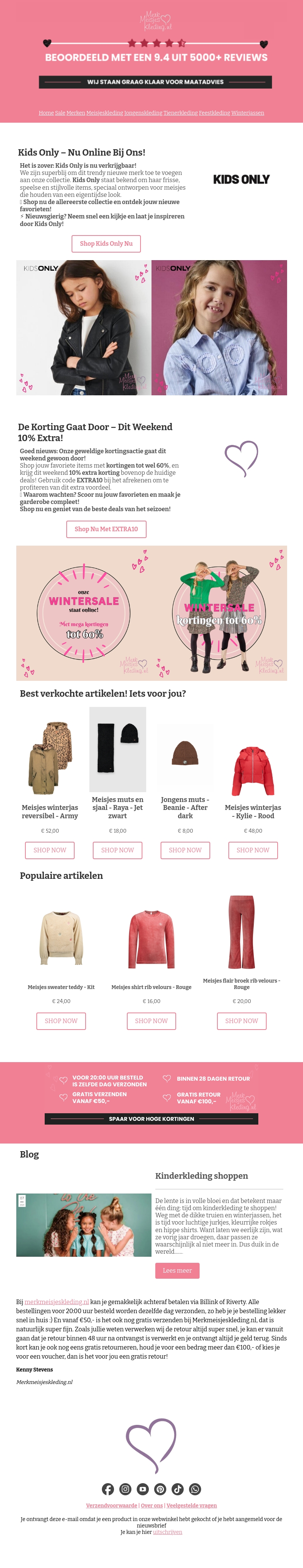 Kids Only is nu verkrijgbaar bij ons! Ontdek de frisse en speelse collectie speciaal voor kinderen. Profiteer dit weekend van 10% extra korting op je favoriete items. Gebruik de code 'EXTRA10' bij het afrekenen. Shop nu en vernieuw de garderobe van je kind!