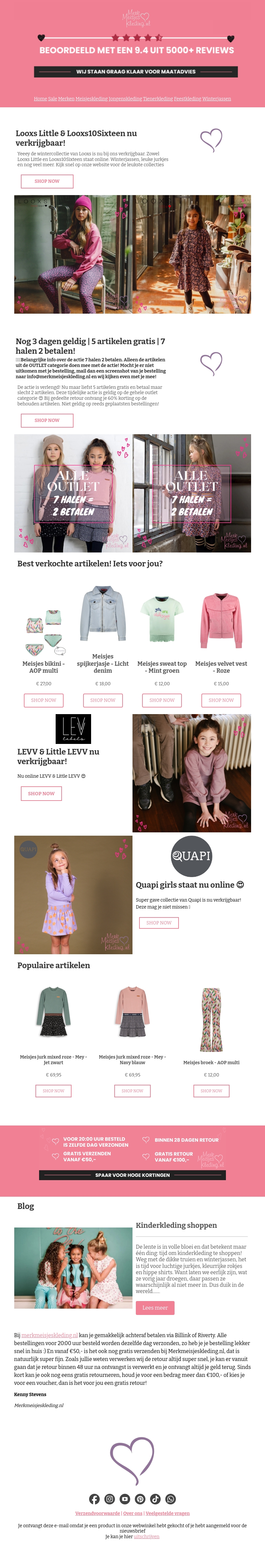 Verken de nieuwste collecties van Looxs, Quapi en LEVV nu bij ons verkrijgbaar. Maak gebruik van exclusieve aanbiedingen zoals '7 halen, 2 betalen' op geselecteerde artikelen. Haal je favoriete modeartikelen vandaag nog in huis!