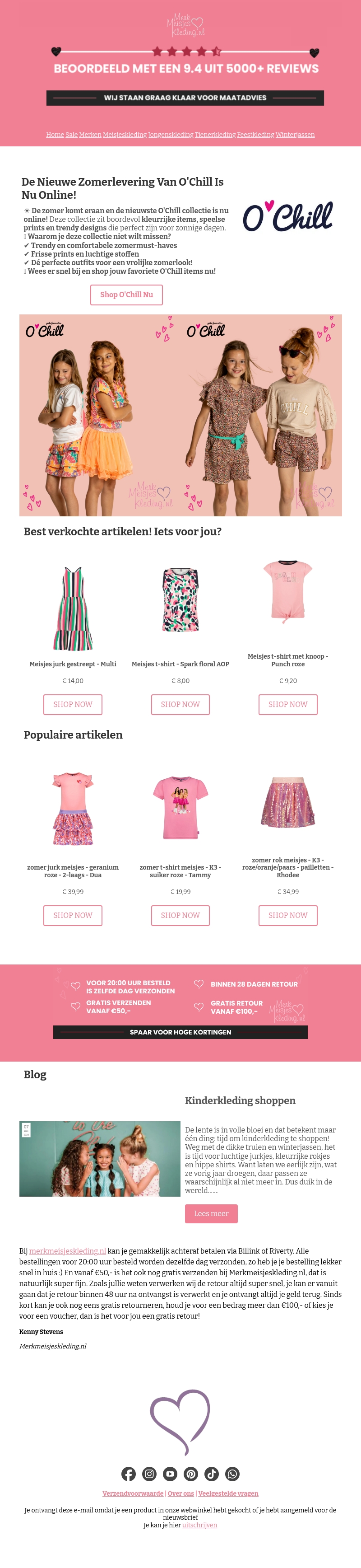 De nieuwste zomercollectie van O'Chill is binnen! Ontdek kleurrijke en frisse outfits perfect voor de zonnige dagen. De collectie zit boordevol must-have items voor meisjes, verkrijgbaar in vrolijke prints en luchtige stoffen. Bestel vandaag nog en geniet van gratis verzending vanaf β¬50 bij Merkmeisjeskleding.nl. Bekijk snel onze best verkochte en populaire artikelen!