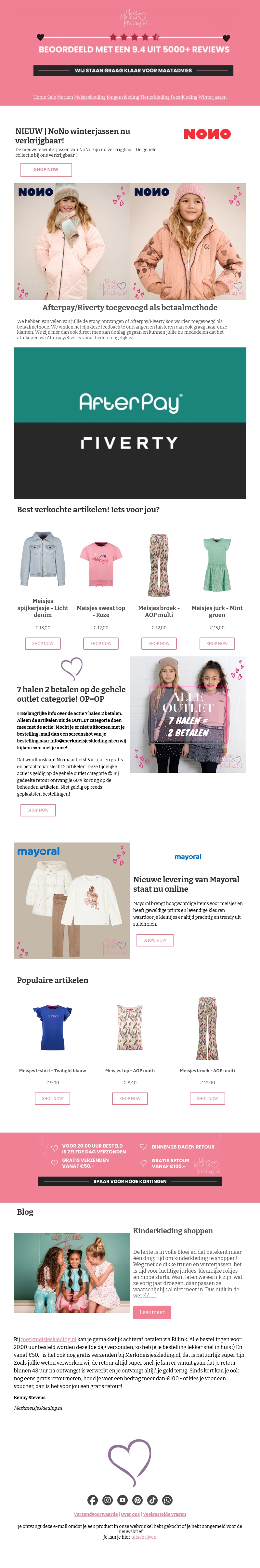 De nieuwste winterjassen van NoNo zijn nu verkrijgbaar! Verkrijg de stijlvolle en warme jassen voor deze winter. Tevens zijn er nieuwe betalingsmethoden beschikbaar: Afterpay en Riverty. Mis de kans niet om te profiteren van de 7 halen 2 betalen aanbieding op geselecteerde outlet items. Bekijk ook de nieuwe levering van Mayoral kleding voor meisjes.
