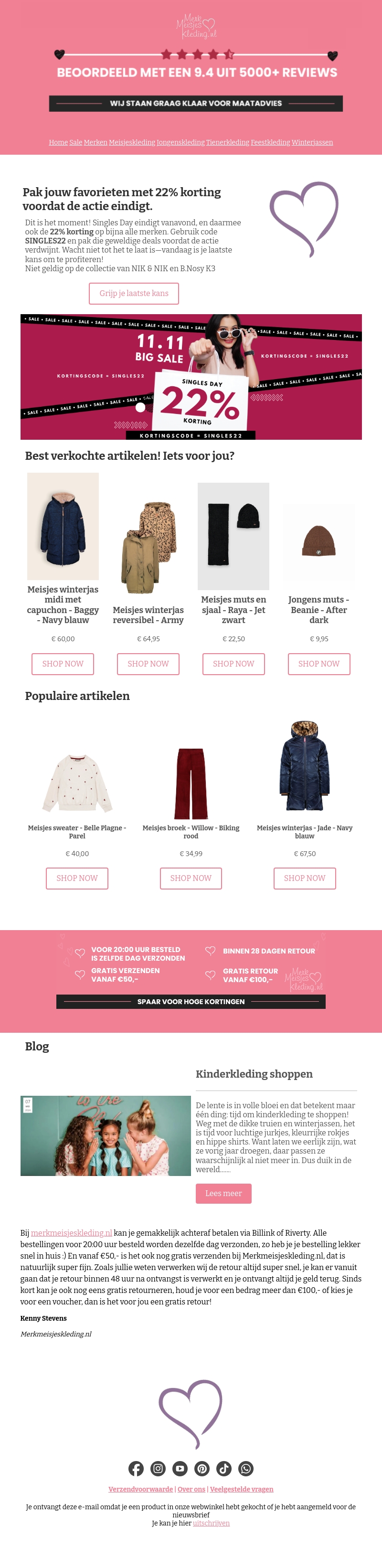 Het is de laatste kans om te profiteren van 22% korting tijdens Singles Day. Gebruik de kortingscode SINGLES22 en scoor je favoriete modeartikelen. Wacht niet te lang, want de actie eindigt vanavond. Ontdek populaire artikelen zoals meisjes winterjassen en truien. Bestel voor 20:00 uur en je bestelling wordt dezelfde dag verzonden.