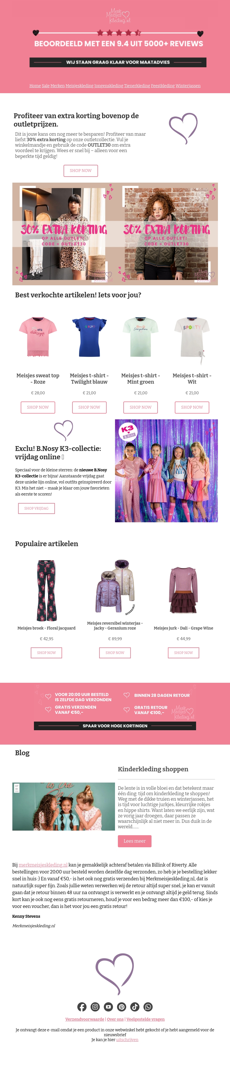 Mis deze kans niet om te besparen op jouw favoriete artikelen. Ontvang tijdelijk 30% extra korting op onze outletcollectie. Vul je winkelmandje en gebruik de code OUTLET30 bij het afrekenen. Ontdek de bestverkochte artikelen en maak je klaar voor een fantastische shopervaring.