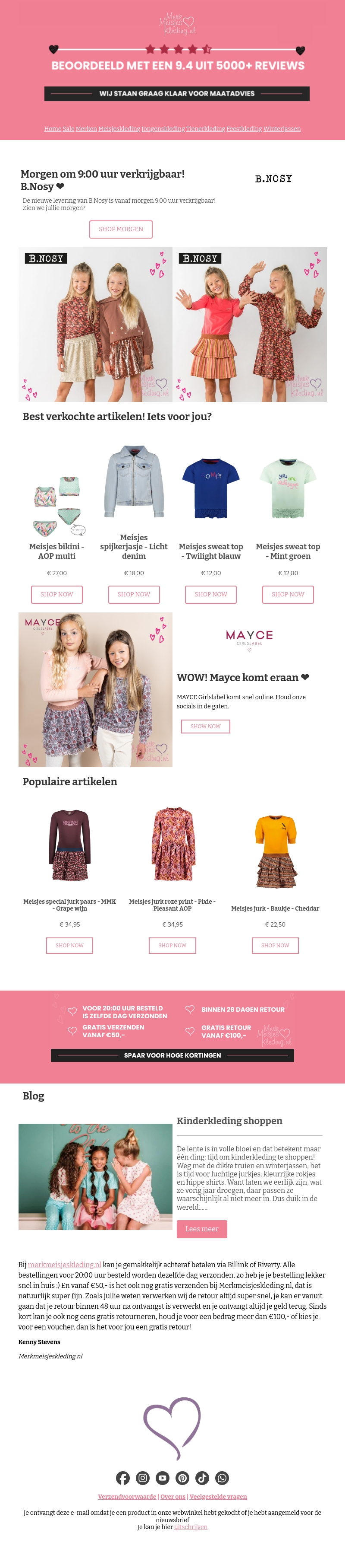 Ontdek de nieuwste B.Nosy collectie vanaf morgen om 9:00 uur! Bekijk de best verkochte artikelen en populaire items. Vergeet ook niet de nieuwe online collectie van Mayce. Shop nu voor de leukste kinderkleding!