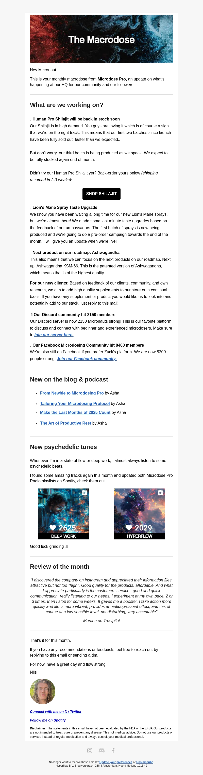 Deze maand biedt Microdose Pro spannende updates en productaankondigingen. De populaire Human Pro Shilajit komt binnenkort weer op voorraad. Er zijn smaakverbeteringen voor Lion's Mane spray en de volgende productlancering is Ashwagandha KSM-66. Verbind met de community via Discord en Facebook en ontdek nieuwe psychedelische muziek.