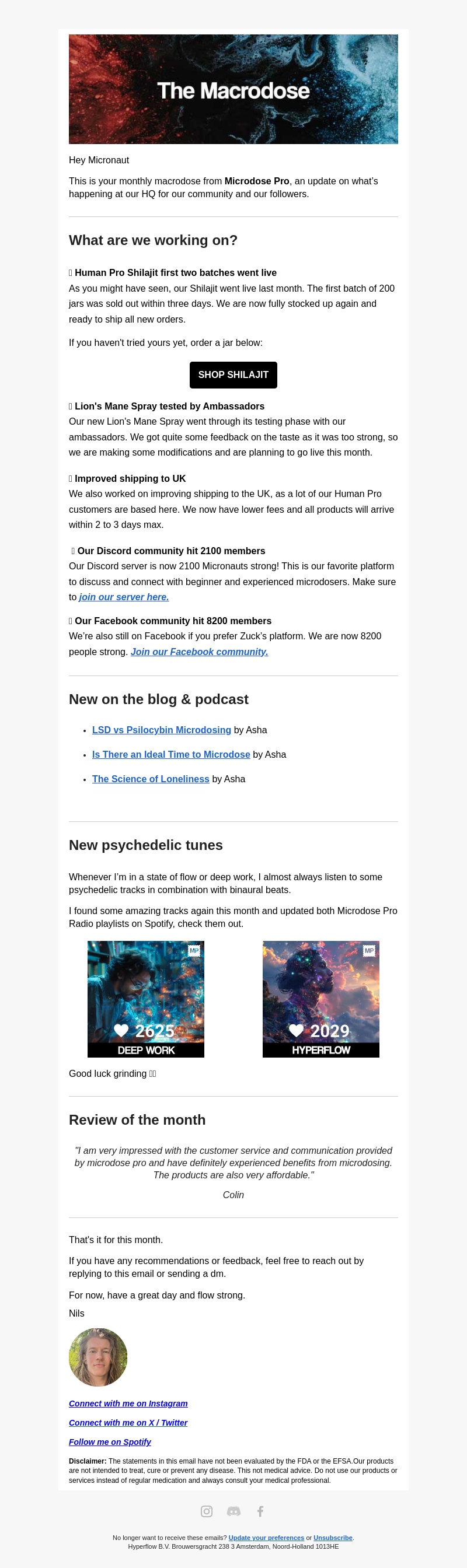 Welkom bij de Macrodose nieuwsbrief van oktober! Ontdek de nieuwste updates van Microdose Pro, waaronder nieuwe productreleases zoals de Shilajit en de Lion's Mane Spray. Lees ook over de verbeteringen in verzendopties naar het Verenigd Koninkrijk en de groeiende online community. Mis ook de nieuwe psychedelische muzieknummers niet!