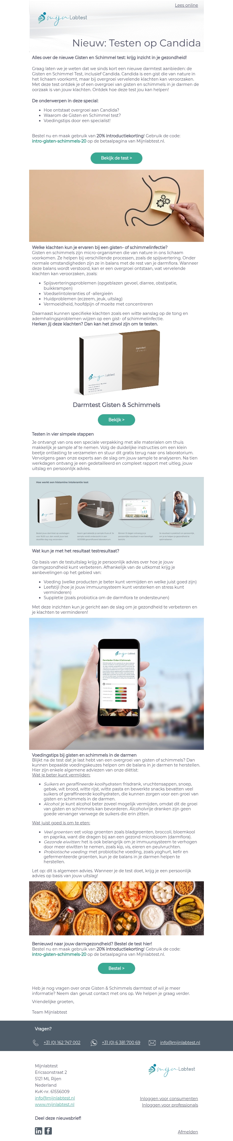 Ervaar je klachten die wijzen op een gisten- of schimmelinfectie? Met de nieuwe Candida-test kun je eenvoudig thuis testen en inzicht krijgen in je darmgezondheid. Gebruik nu onze introductiekorting voor een voordelige test. Bestel vandaag en ontdek wat jouw gezondheid kan verbeteren.