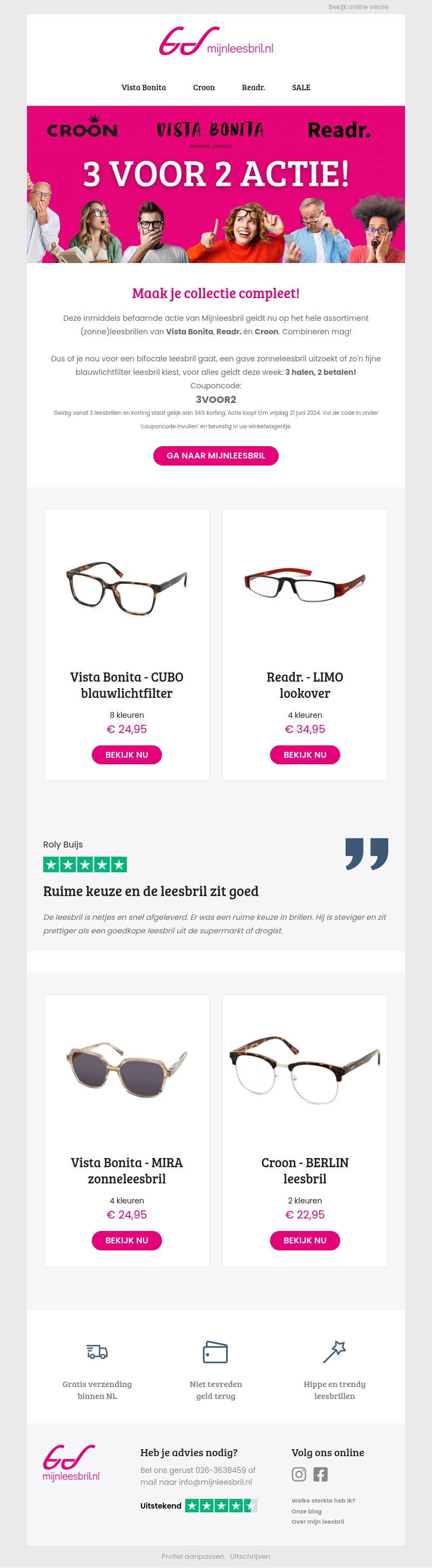 Maak je collectie compleet met onze exclusieve 3 voor 2 actie op leesbrillen van Vista Bonita, Readr. en Croon! Of je nu op zoek bent naar bifocale leesbrillen, zonneleesbrillen of blauwlichtfilter brillen, wij hebben een breed assortiment om uit te kiezen. De actie is geldig vanaf 3 leesbrillen en biedt 34% korting. Gebruik de couponcode 3VOOR2 om de korting te activeren. Geldig t/m 21 juni 2024.