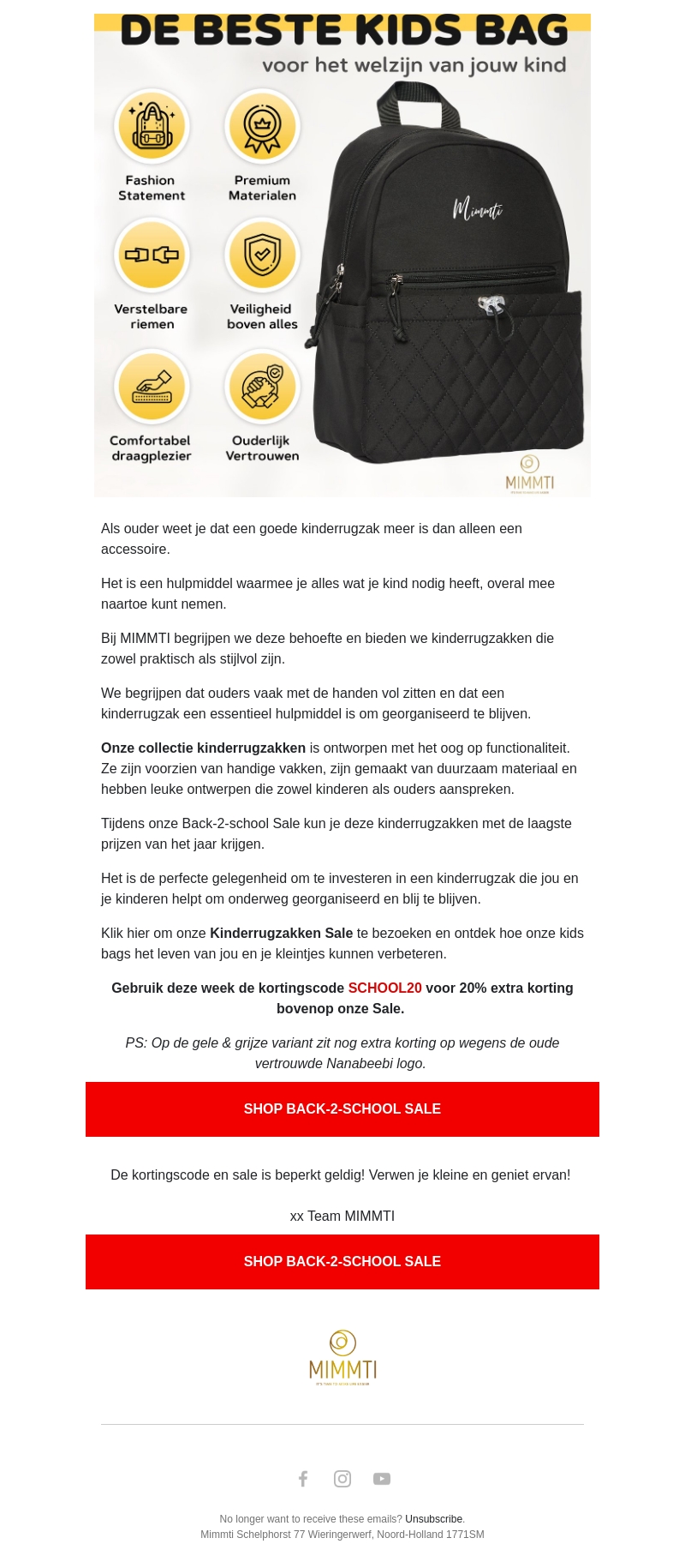 Een goede kinderrugzak is meer dan alleen een accessoire. Bij MIMMTI bieden we rugzakken die zowel praktisch als stijlvol zijn, ontworpen om ouders en kinderen te helpen georganiseerd te blijven. Onze rugzakken zijn gemaakt van duurzame materialen en komen met handige vakken. Profiteer nu van de Back-2-School Sale en gebruik de kortingscode SCHOOL20.