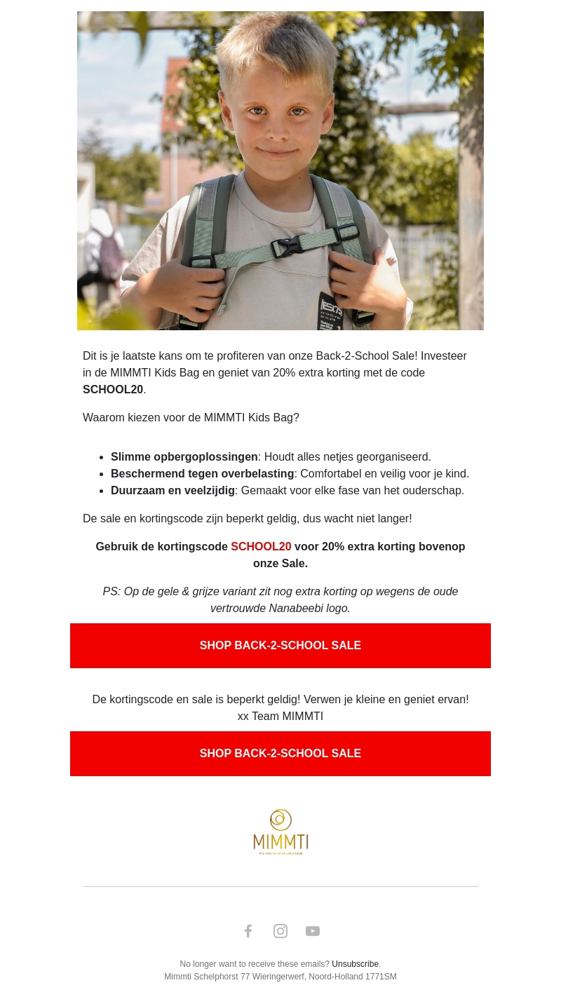Dit is je laatste kans om te profiteren van onze Back-2-School Sale! Investeer in de MIMMTI Kids Bag en geniet van 20% extra korting met de code SCHOOL20. De sale en kortingscode zijn beperkt geldig, dus wacht niet langer!
