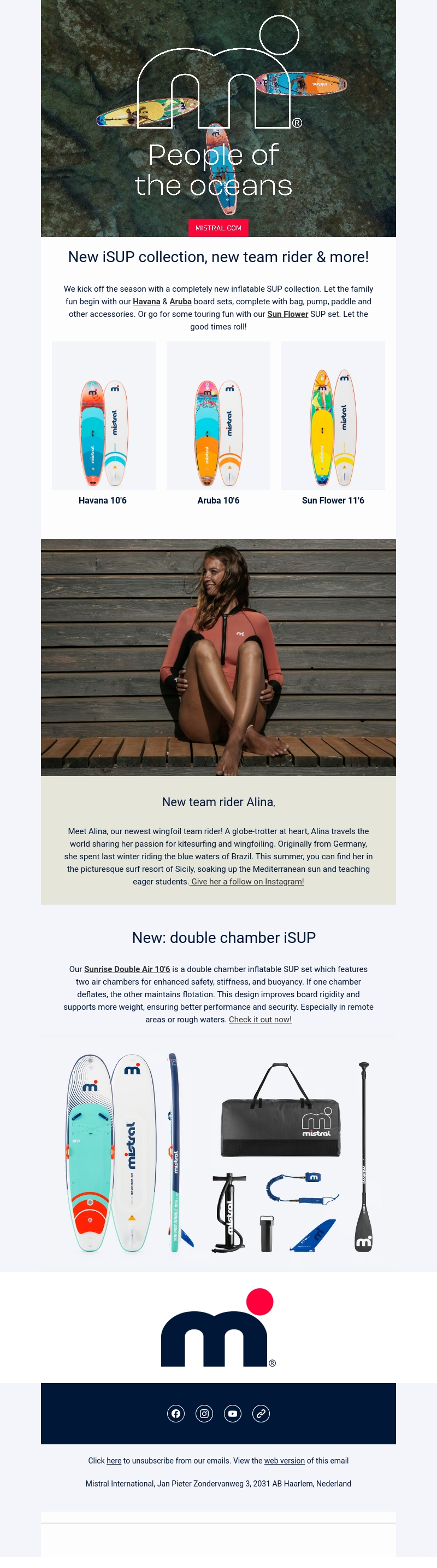 Begin het seizoen met onze nieuwe opblaasbare SUP collectie. Ontmoet Alina, ons nieuwste teamlid, en ontdek onze nieuwe Sunrise Double Air 10'6 met dubbele kamer. Bekijk de Havana, Aruba en Sun Flower sets voor eindeloos plezier. Mis het niet!
