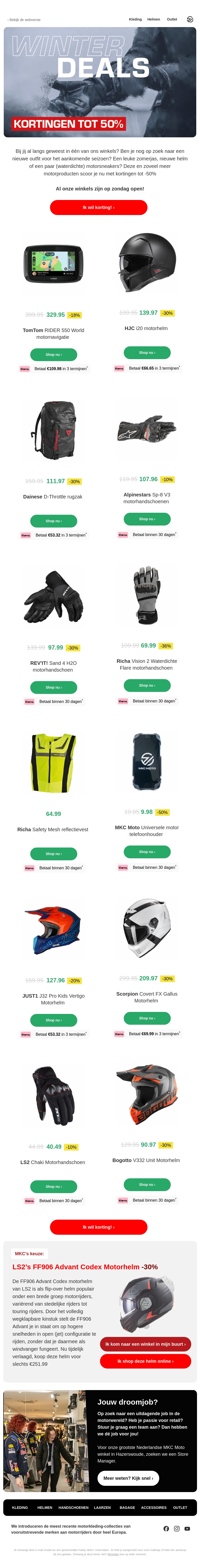Mis de winterdeals niet! Ontvang kortingen tot 50% op diverse motorproducten zoals helmen, handschoenen en meer. Bezoek onze winkel of shop online voor de beste aanbiedingen. Wees er snel bij, want op=op!