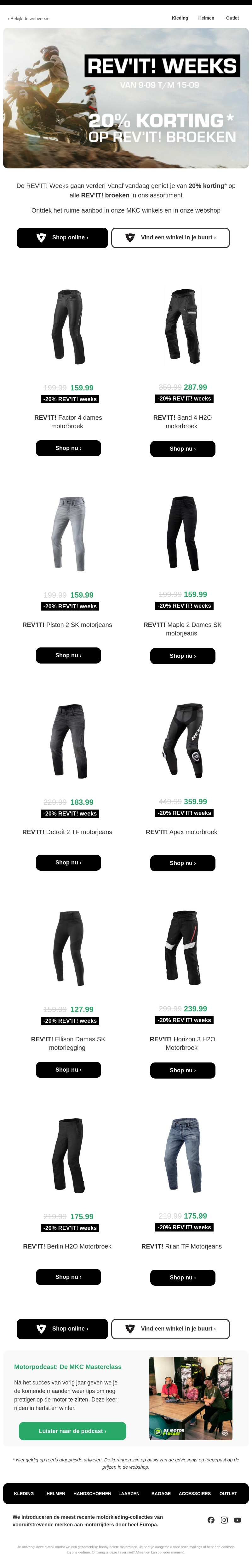 De REV'IT! Weeks gaan verder! Profiteer nu van 20% korting op een breed assortiment aan REV'IT! motorbroeken. Bezoek onze MKC winkels of shop online voor de nieuwste aanbiedingen. Mis het niet!