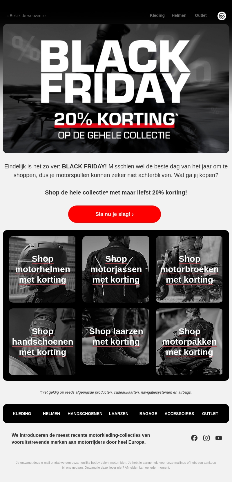 Ontdek onze spectaculaire Black Friday aanbiedingen met 20% korting op de volledige collectie motoruitrusting. Van motorhelmen tot laarzen, dit is het perfecte moment om te investeren in kwaliteit. Mis deze kans niet en profiteer van exclusieve kortingen.