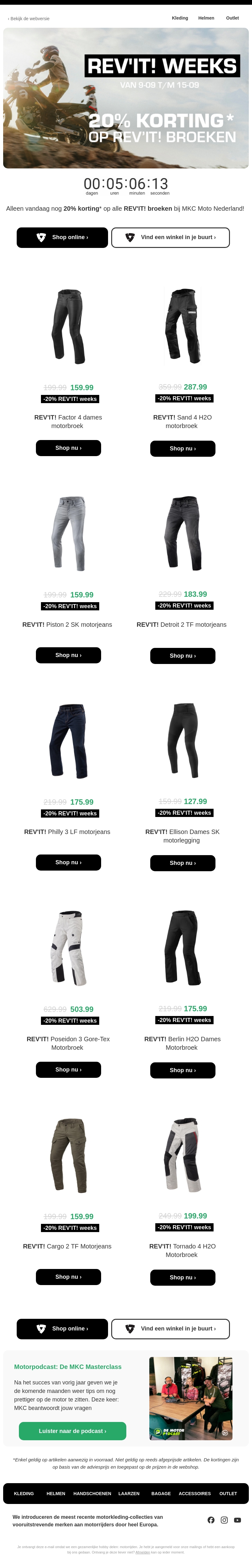 Grijp nu je kans om te profiteren van 20% korting op alle REV'IT! broeken bij MKC Moto. De actie is geldig tot en met 15 september. Bestel online of vind een winkel bij jou in de buurt. Mis het niet!
