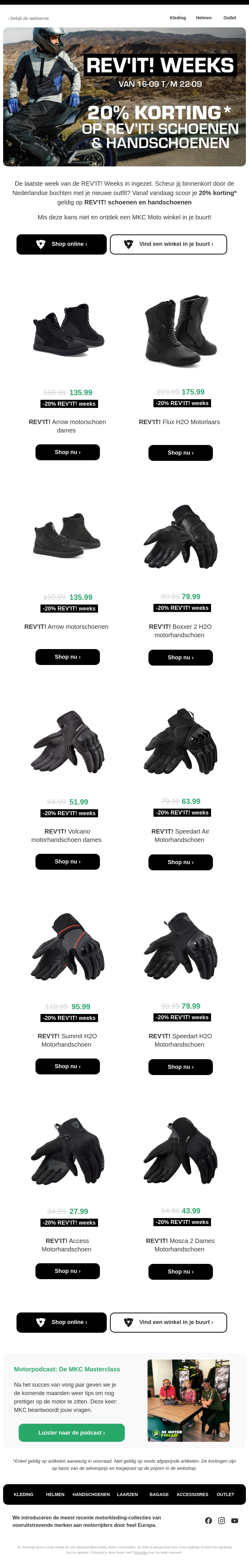 De laatste week van de REV'IT! Weeks is aangebroken met 20% korting op een select assortiment schoenen en handschoenen. Mis deze kans niet om nieuwe gear aan te schaffen voordat de actie voorbij is!