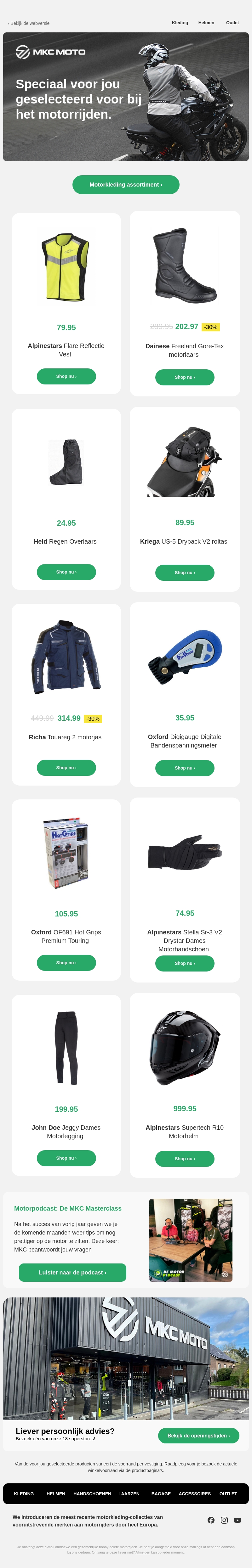 Welkom bij de nieuwste nieuwsbrief van MKC Moto. Ontdek onze nieuwste motoraccessoires en kledingstukken met geweldige kortingen. Van veiligheidsvesten tot robuuste tassen en handschoenen, er is voor elk wat wils. Mis de speciale aanbiedingen niet!
