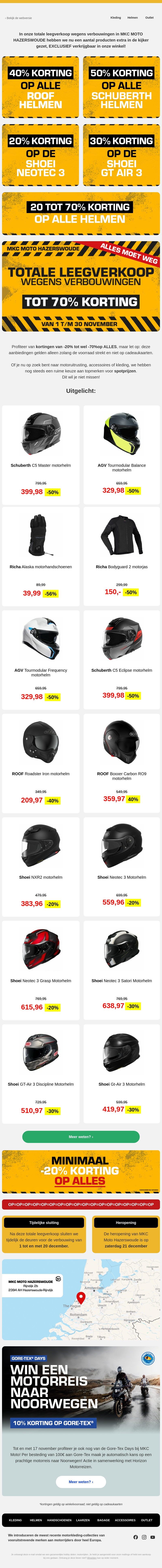 Geniet van spectaculaire kortingen van 20% tot 70% op een breed scala aan helmen en motorkleding bij MRC Moto Hazerswoude. Of je nu op zoek bent naar een ROOF, Schuberth of Shoei helm, je vindt zeker een geweldige deal. Deze totale leegverkoop biedt de perfecte kans om je uitrusting te upgraden. Actie loopt van 1 tot 30 november, dus wees er snel bij.