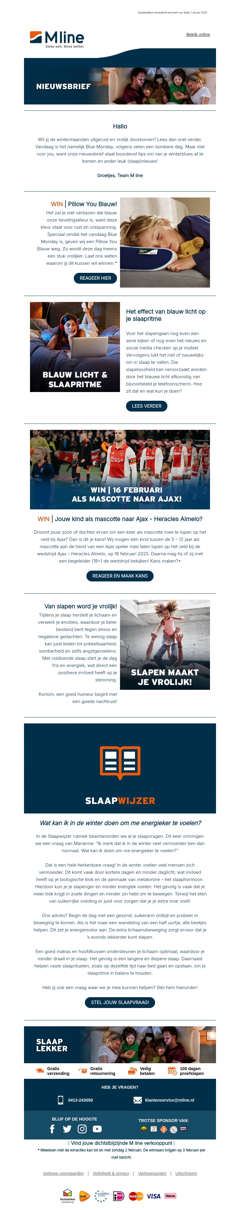Ontsnap aan Blue Monday met de nieuwste slaapoplossingen van M Line. Maak kans op een exclusieve Pillow You Blauw en ontdek hoe blauw licht je slaap beïnvloedt. Doe mee aan onze wedstrijd voor een mascotteplek bij Ajax. Bovendien helpen onze tips tegen wintermoeheid om je beter te voelen.