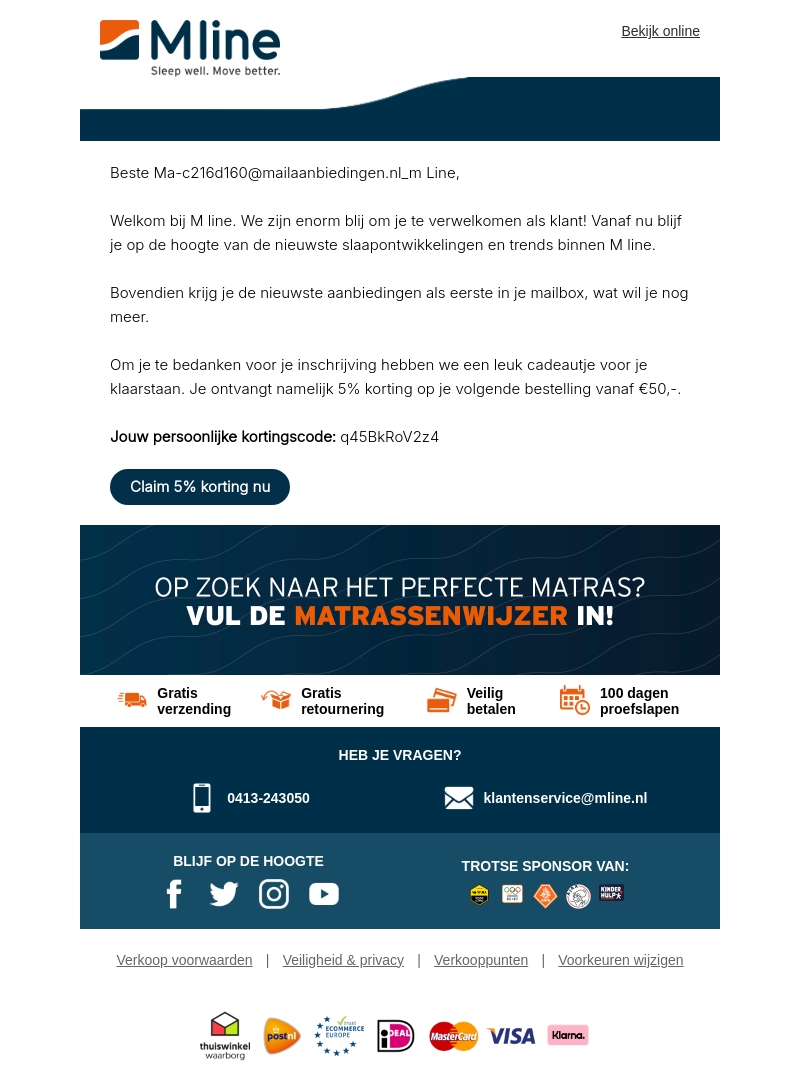 Welkom bij M line! We zijn blij om je te verwelkomen als klant. Blijf op de hoogte van de nieuwste slaapontwikkelingen en trends. Ontvang de nieuwste aanbiedingen als eerste rechtstreeks in je inbox. Gebruik de kortingscode q45BkRoVz24 voor 5% korting op je volgende bestelling.