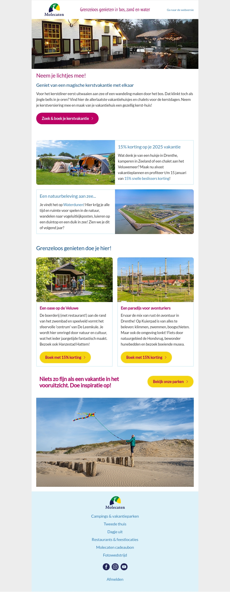 Ontsnap naar de natuur en vier een magische kerst met Molecaten. Geniet van de rust aan zee of kies voor avontuur in de bossen. Boek nu je vakantiehuis of chalet en maak er een onvergetelijke kerst van. Pak je kans op 15% korting voor 2025 vakanties. Laat je inspireren en ontdek de prachtige locaties die Molecaten te bieden heeft. Wacht niet te lang, deze unieke ervaringen zijn gewild!