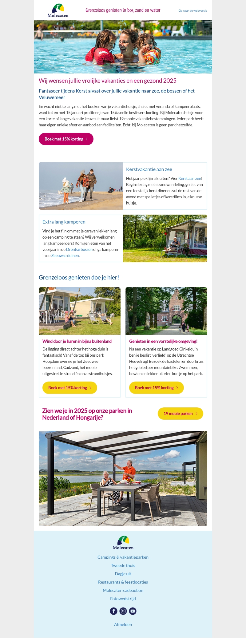 Beleef een onvergetelijke vakantie bij Molecaten met speciale kerstdeals en een aantrekkelijke 15% snelle beslissers korting. Of u nu kiest voor een vakantiehuisje, chalet of kampeerplaats, onze unieke bestemmingen bieden voor ieder wat wils. Geniet van strandwandelingen, feestelijke kerstdiners en unieke faciliteiten. Verken de prachtige Drentse bossen of de Zeeuwse duinen voor een extra lang verblijf. Begin 2025 vol avontuur en ontspanning bij onze bijzondere vakantieparken in Nederland en Hongarije.