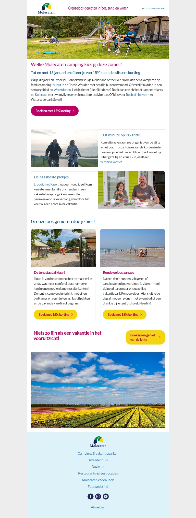 Ontdek onbekende plekken in Nederland met Molecaten. Boek je vakantie op een van de schilderachtige campings en bespaar 15% als snelle beslisser. Geniet van activiteiten voor zowel kinderen als volwassenen. Onze campings bieden de mogelijkheid van luxe tot basic accommodaties. Dompel jezelf onder in de natuur en rust aan de kust of in het bos.