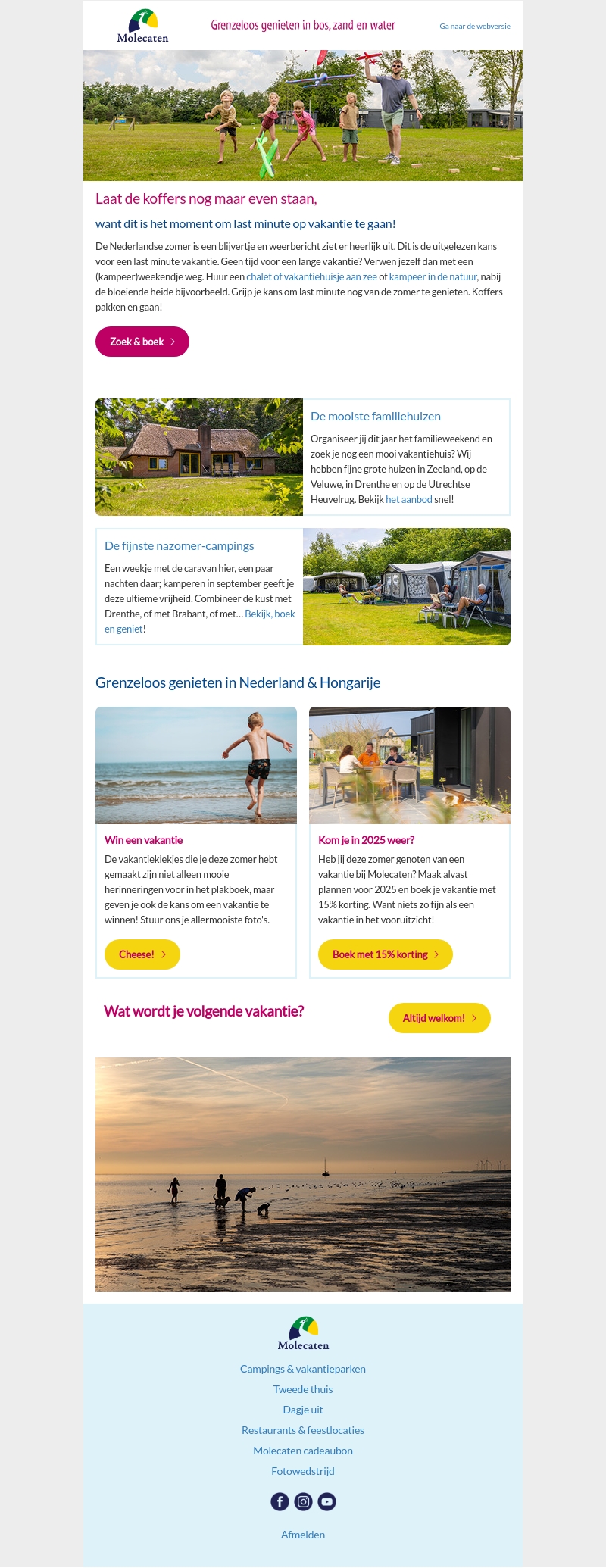 Laat de koffers nog maar even staan, want het is tijd voor een last-minute vakantie met Molecaten! Geniet van prachtige kampeer- en vakantiehuizen aan zee en in de natuur. Of plan je vakantie voor 2025 en bespaar 15% korting! Tevens maak je kans om een vakantie te winnen door je mooiste vakantieherinneringen te delen.