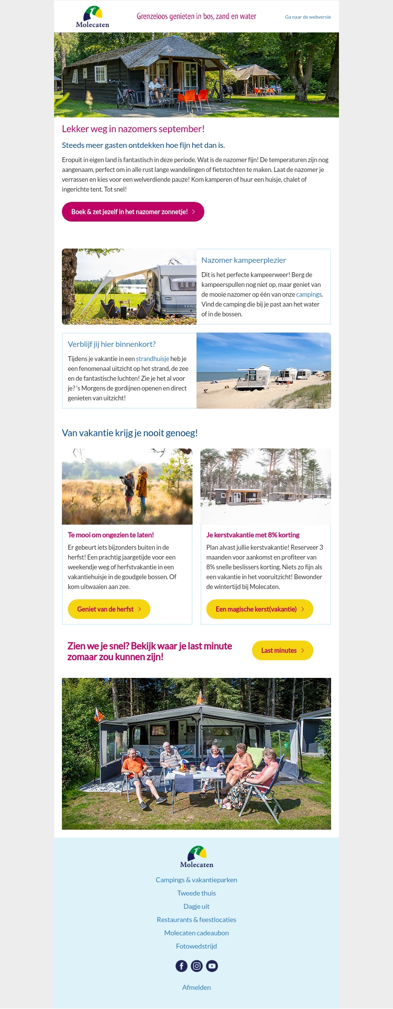 Ontsnap aan de routine en geniet van de nazomer bij Molecaten. Of je nu kiest voor een gezellige kampeertrip, een luxe strandhuisje of een knusse chalet, er is voor ieder wat wils. Laat de nazomer je verrassen en geniet van de natuur.
