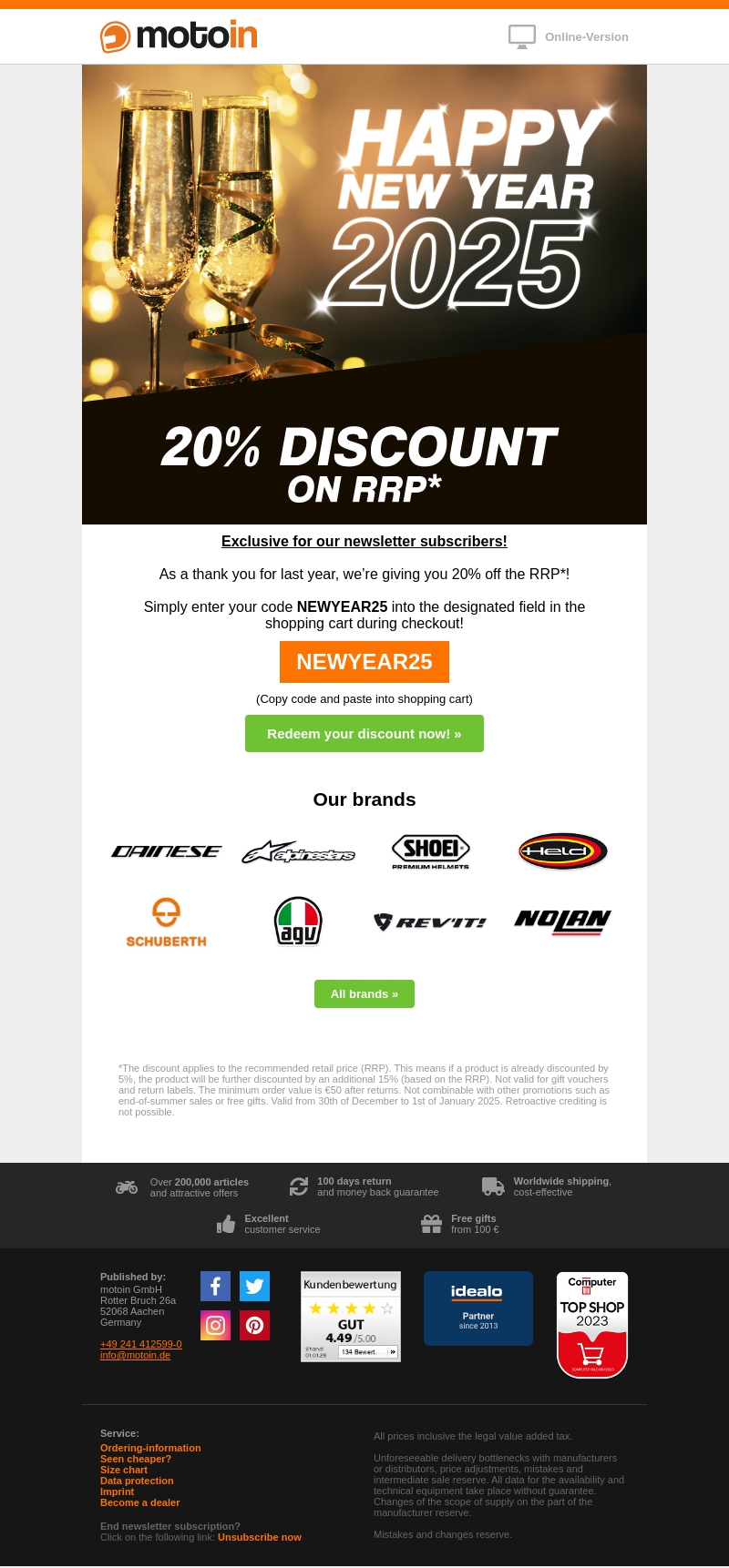 Vier het nieuwe jaar met een exclusieve korting van 20% op de RRP bij Motoin! Alleen voor onze nieuwsbriefabonnees, gebruik de code NEWYEAR25 bij uw volgende aankoop. Mis deze kans niet om te profiteren van geweldige deals op topmerken! Begin het jaar goed en winkel nu bij Motoin.