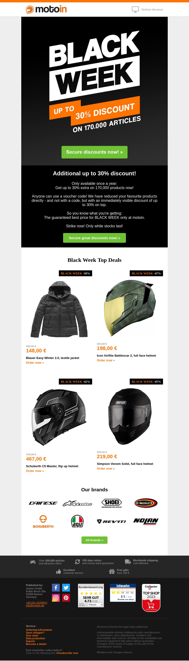 Profiteer van de Black Week aanbiedingen bij motoin.nl met kortingen tot wel 30% op 170.000 artikelen. Dit is de perfecte kans om je favoriete producten te bemachtigen tegen fantastische prijzen. Of je nu op zoek bent naar een nieuwe motorjas of een helm, je vindt het allemaal. Mis deze exclusieve deals niet, ze zijn slechts beperkte tijd beschikbaar. Bezoek onze site om te kijken wat we te bieden hebben. Sla nu toe voordat de voorraad op is!