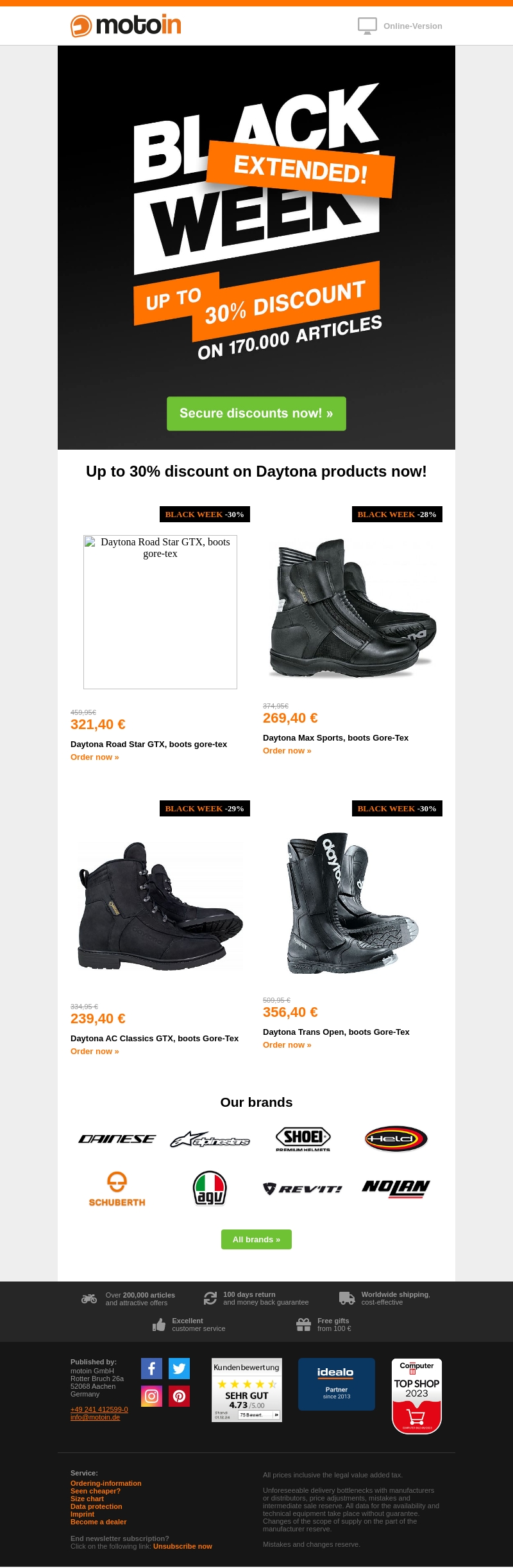 Profiteer nu van onze Black Week-uitbreiding met forse kortingen op Daytona-producten. Van de robuuste Road Star GTX tot de stijlvolle Max Sports laarzen, er is voor ieder wat wils. Deze week ontvang je tot 30% korting op meer dan 170.000 artikelen. Haal vandaag nog de beste motoruitrusting in huis!
