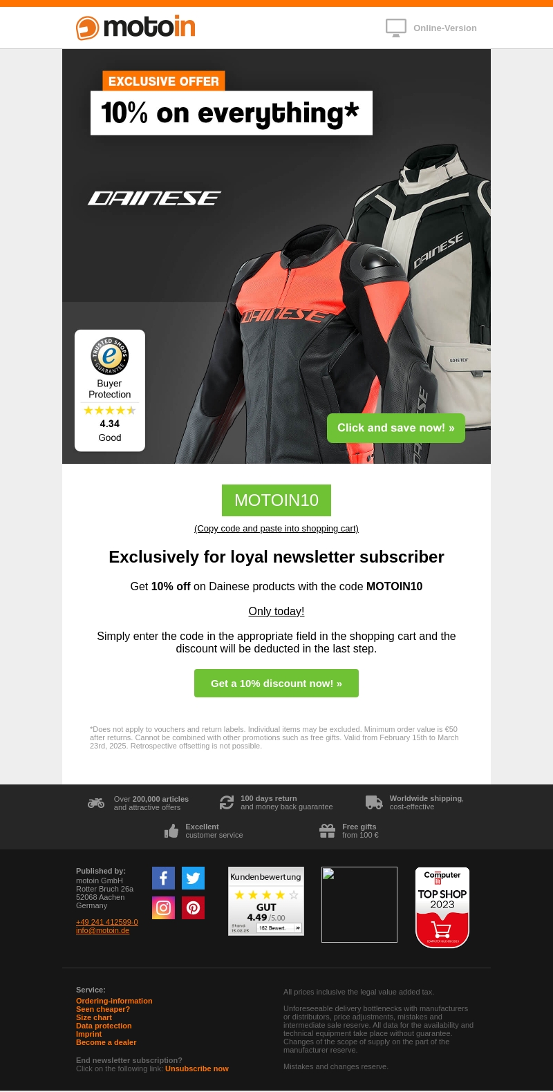 Profiteer van een exclusieve 10% korting op alle Dainese-producten bij Motoin. Gebruik de speciale code MOTOIN10 tijdens uw aankoop. Deze aanbieding geldt alleen vandaag, dus mis het niet! Geniet van topproducten die uw rijervaring verhogen. Schrijf u in voor de nieuwsbrief voor meer geweldige deals.