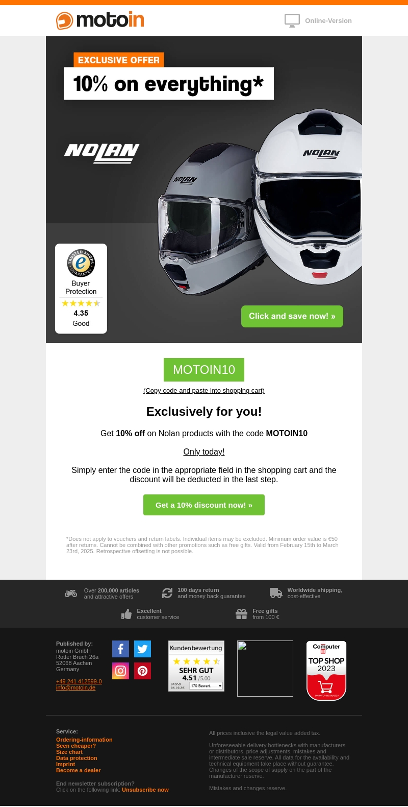 Profiteer van een exclusieve 10% korting op alle Nolan producten bij motoin. Gebruik de kortingscode MOTO10N bij het afrekenen en bespaar direct. Deze aanbieding is slechts tijdelijk geldig. Mis deze kans niet om kwalitatieve motorhelmproducten voordelig aan te schaffen. Bekijk het uitgebreide assortiment en kies jouw favoriete items!