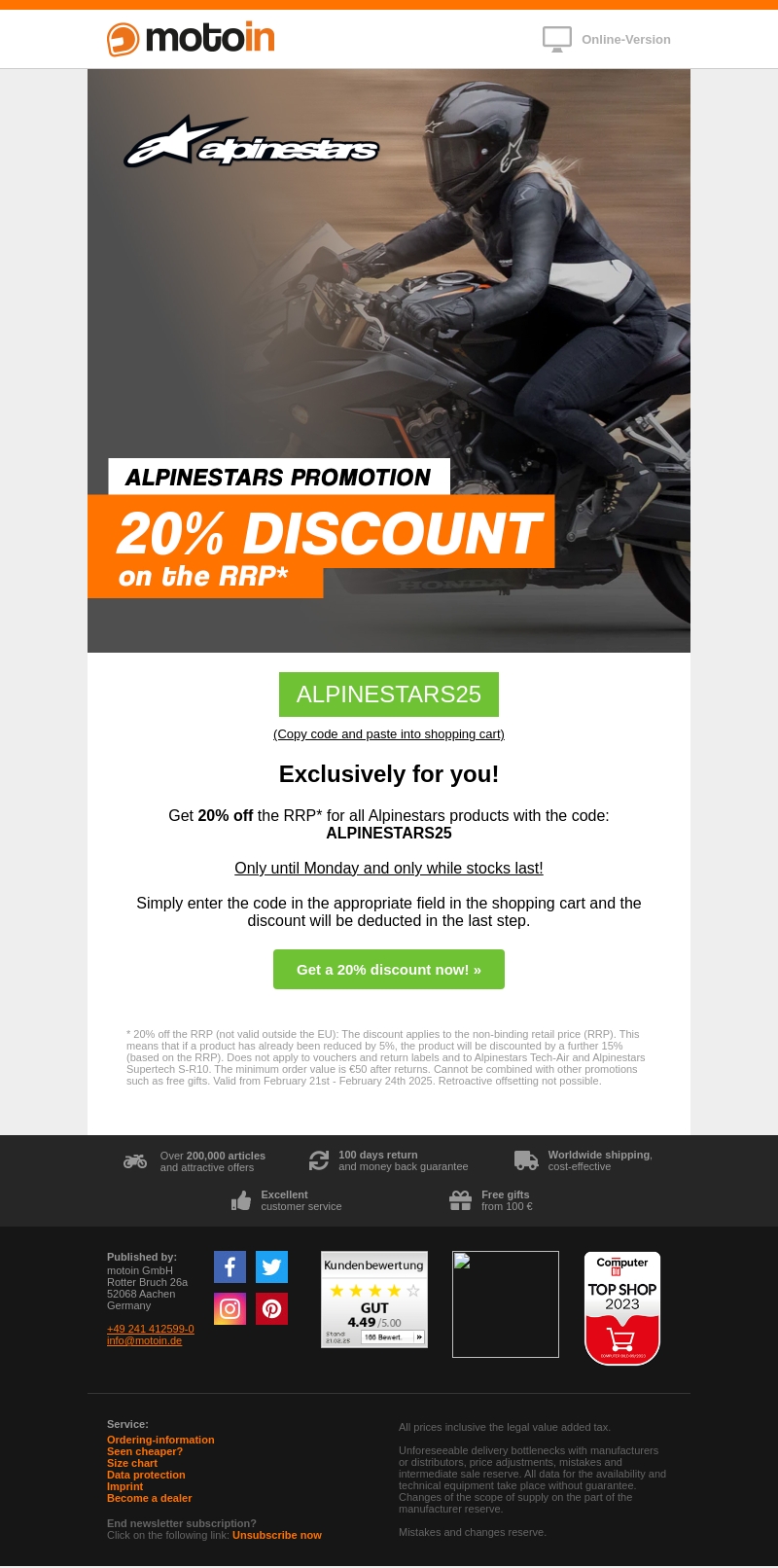 Profiteer van een exclusieve korting van 20% op alle Alpinestars producten met de kortingscode ALPINESTARS25. Deze aanbieding geldt tot en met maandag en zolang de voorraad strekt. Voer de code in tijdens het afrekenen om de korting te ontvangen. Let op, de korting is niet beschikbaar in combinatie met andere promoties of gratis geschenken. Zorg ervoor dat u snel handelt om van deze aanbieding te profiteren!