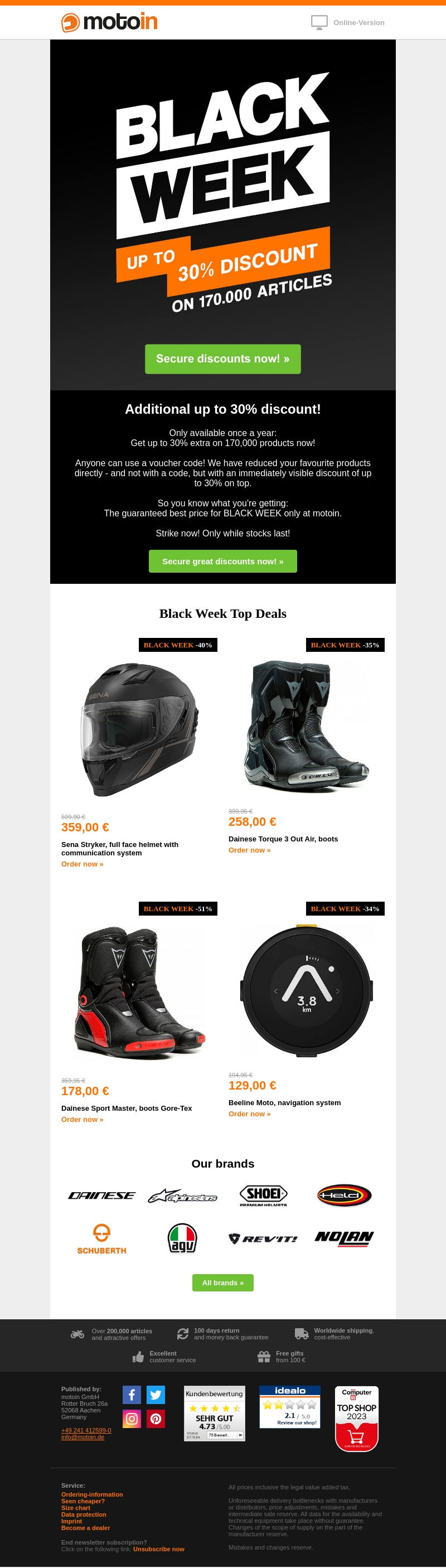 Black Week is in volle gang bij Motoin! Profiteer nu van tot wel 30% extra korting op 170.000 producten. Van beschermende helmen tot navigatiesystemen, grijp de kans om je favoriete items tegen de beste prijs aan te schaffen. Wacht niet te lang, want de voorraad is beperkt. Bezoek onze website en bestel nu om te besparen!