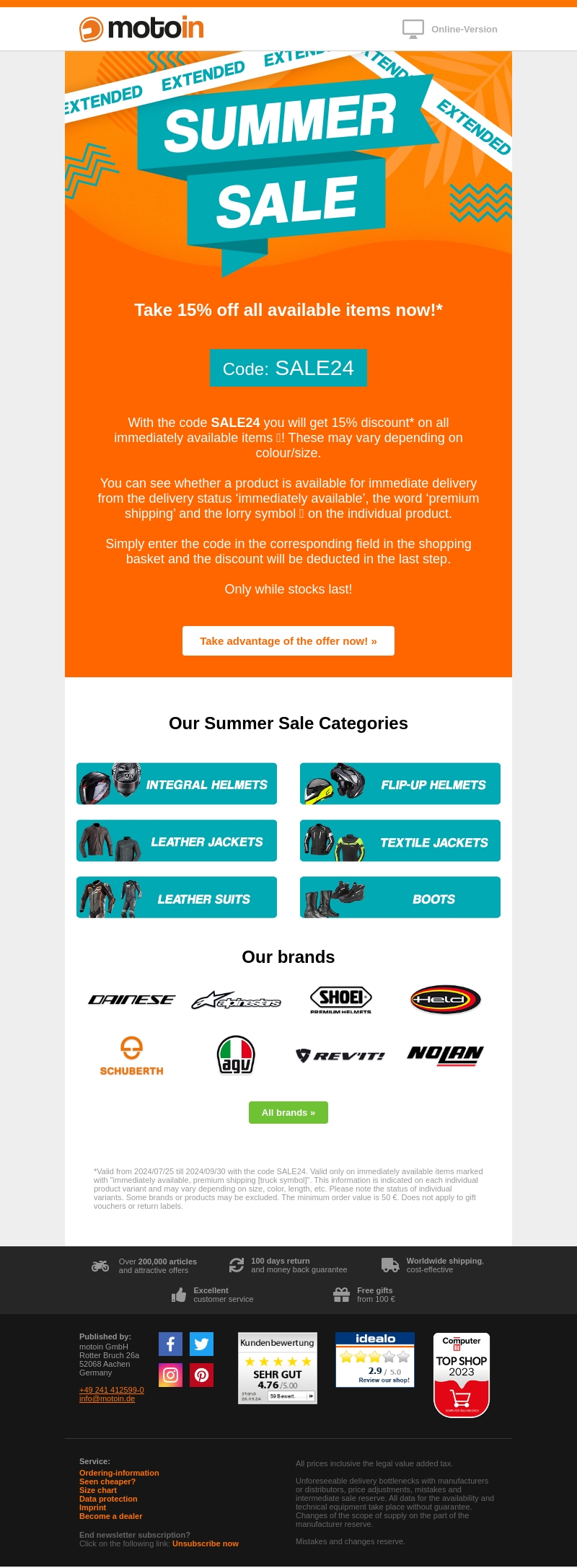 Gebruik de code SALE24 voor 15% korting op direct beschikbare items bij Motoin! Deze aanbieding geldt voor diverse helm-, jas-, en laarsmodellen van topmerken zoals Dainese en Shoei. Bekijk het actuele aanbod en shop nu vóórdat de voorraad op is.