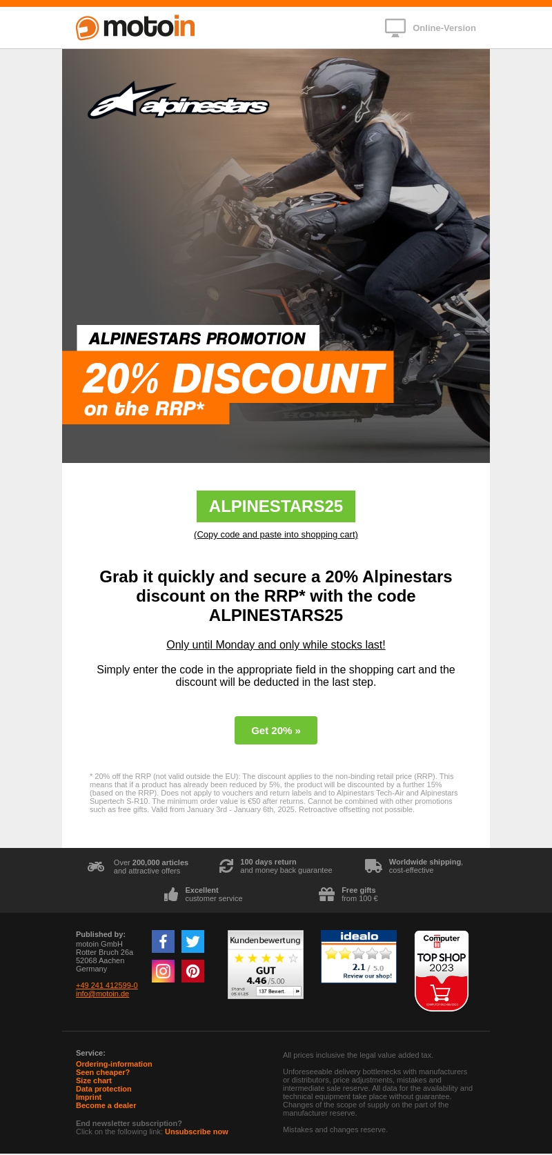 Profiteer van een exclusieve 20% korting op Alpinestars-producten met de code ALPINESTARS25. Deze aanbieding geldt alleen tot maandag of zolang de voorraad strekt. Plaats de code eenvoudig in uw winkelwagen om de korting te ontvangen. Zorg ervoor dat u bestelt voordat de tijd om is!