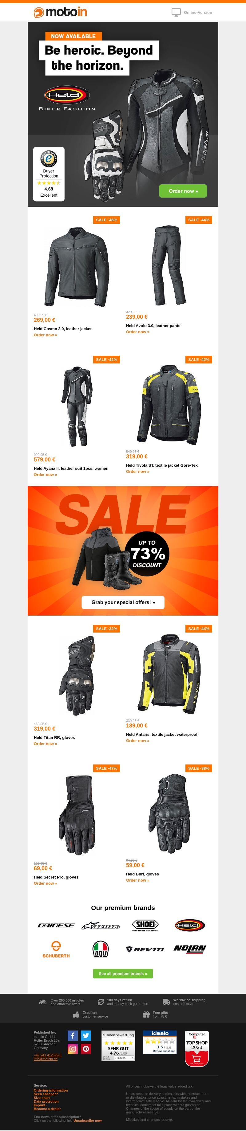 Duik in de nieuwste Held Biker Fashion promoties bij motoin! Profiteer van aantrekkelijke kortingen op motorjassen, broeken en handschoenen. Deze nieuwsbrief biedt exclusieve deals om je motoruitrusting te upgraden. Mis deze kans niet om hoogwaardige spullen met fantastische kortingen te bemachtigen. Bestel nu en ervaar de kwaliteit van Held. Actie geldig zolang de voorraad strekt.