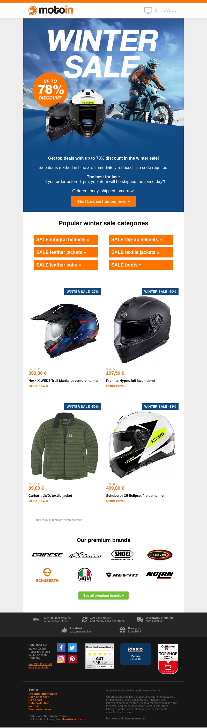 De winteruitverkoop van Motoin biedt kortingen tot maar liefst 78% op diverse producten zoals helmen, jassen en laarzen. Plaats je bestelling vรณรณr 14:00 uur en profiteer van verzending op dezelfde dag. Ontdek nu de geweldige aanbiedingen van topmerken zoals Dainese, Shoei en AGV.