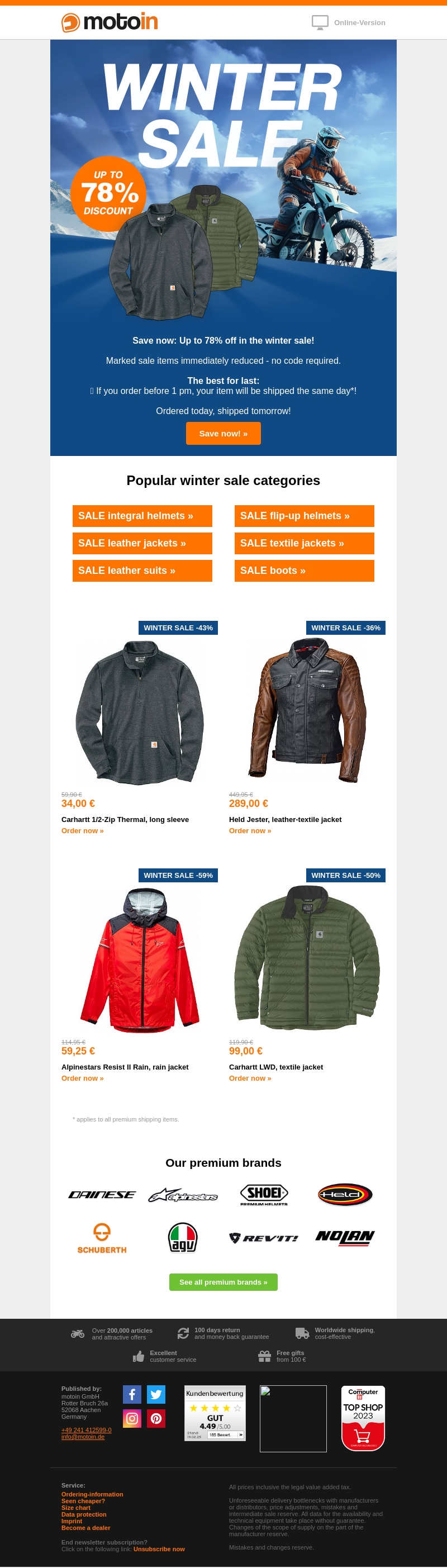 De Moto-in Winter Sale is begonnen! Profiteer van kortingen tot maar liefst 78% op geselecteerde winteritems. Van helmen en jassen tot laarzen, elke motorliefhebber vindt iets passends. Bestel vóór 14.00 uur en je bestelling wordt dezelfde dag verzonden. Mis deze unieke kans niet en bereid je voor op het koude seizoen met onze premium merken.