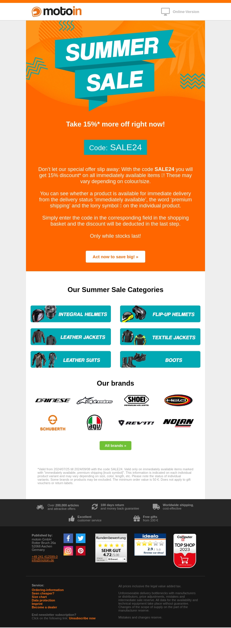 Ontdek onze speciale zomeruitverkoop! Krijg 15% korting op direct beschikbare artikelen met de code SALE24. Shop nu de beste deals op integraalhelmen, leren jassen, textieljassen en meer. Wees er snel bij, want deze aanbieding geldt alleen zolang de voorraad strekt!