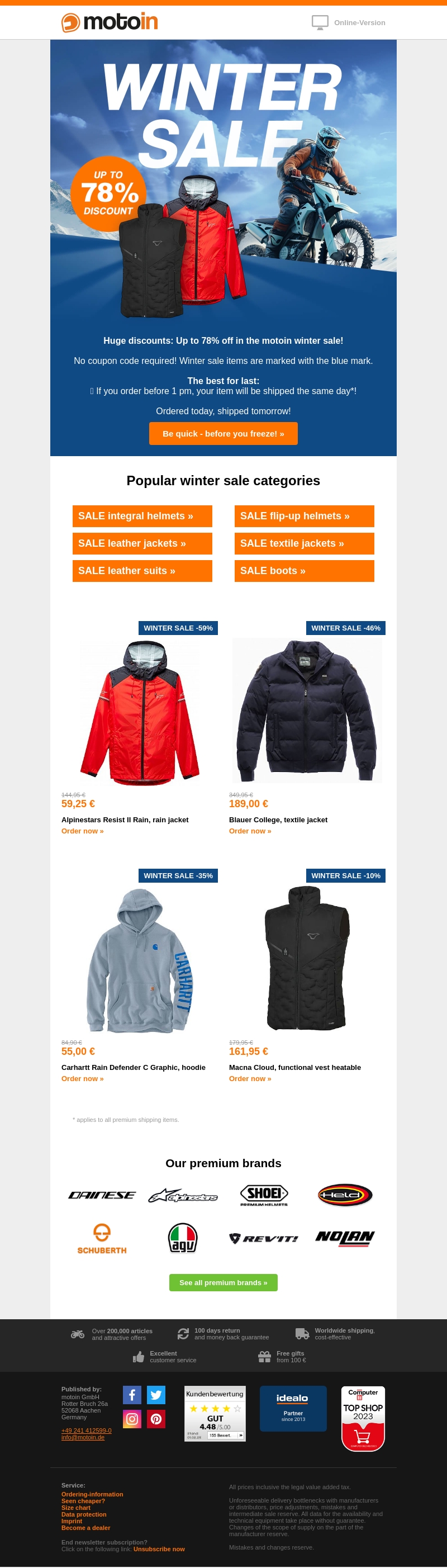 Profiteer van de motoin winterkorting en bespaar tot 78% op geselecteerde artikelen. De winterverkoop omvat een brede selectie van jassen, helmen en vesten. Alle artikelen gemarkeerd met blauw komen zonder kortingscode. Bestel vรณรณr 14.00 uur en ontvang je bestelling de volgende dag. Wees er snel bij, want op is op!