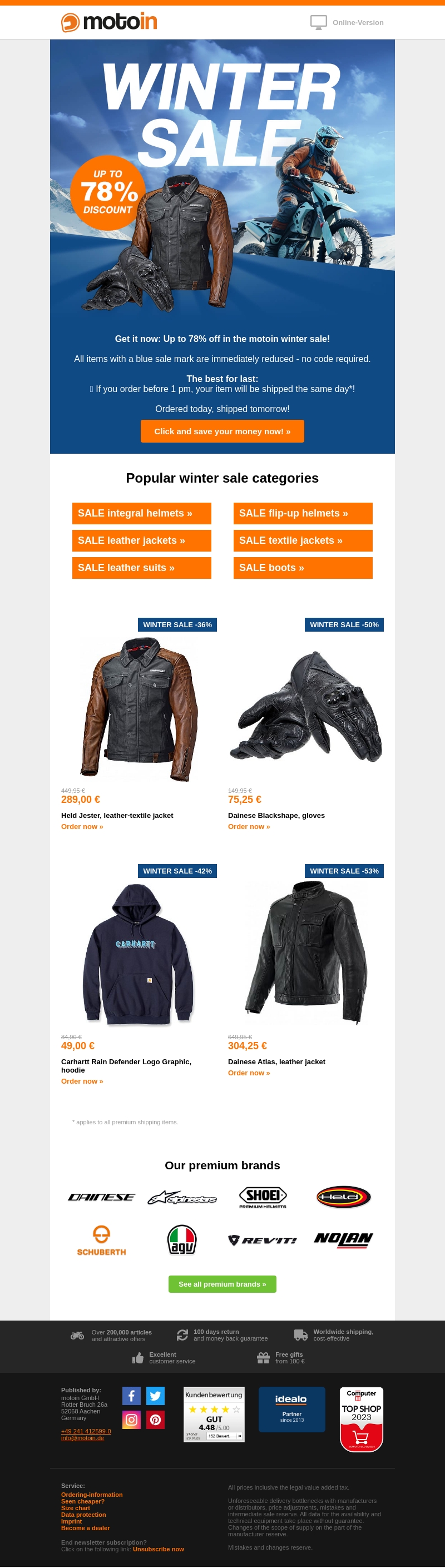 Ontdek geweldige aanbiedingen met kortingen tot 78% in onze winteruitverkoop! Van helmen tot leren jassen, alles is geprijsd om snel te verkopen. Bestel voor 13.00 uur en je items worden dezelfde dag nog verzonden. Geen kortingscode nodig, alle acties zijn direct van toepassing. Mis deze kans niet om je motorkledingcollectie uit te breiden. Klik en bespaar nu!