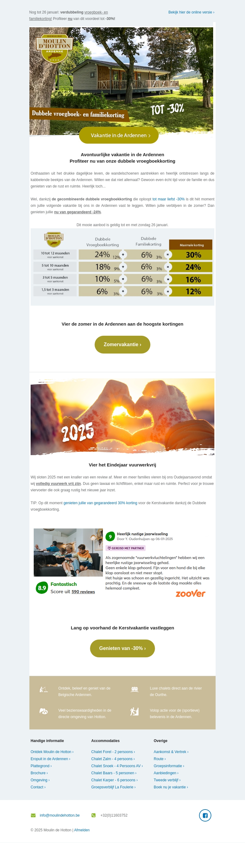 Profiteer nog tot 26 januari van dubbele vroegboekkorting tot wel 30% in de adembenemende Ardennen. Ontsnap aan de dagelijkse drukte en geniet van rust en avontuur met het hele gezin. Boek nu en verzeker jezelf van de beste vakantiedeals. Ontdek luxe chalets en tal van activiteiten in de prachtige omgeving van Hotton.