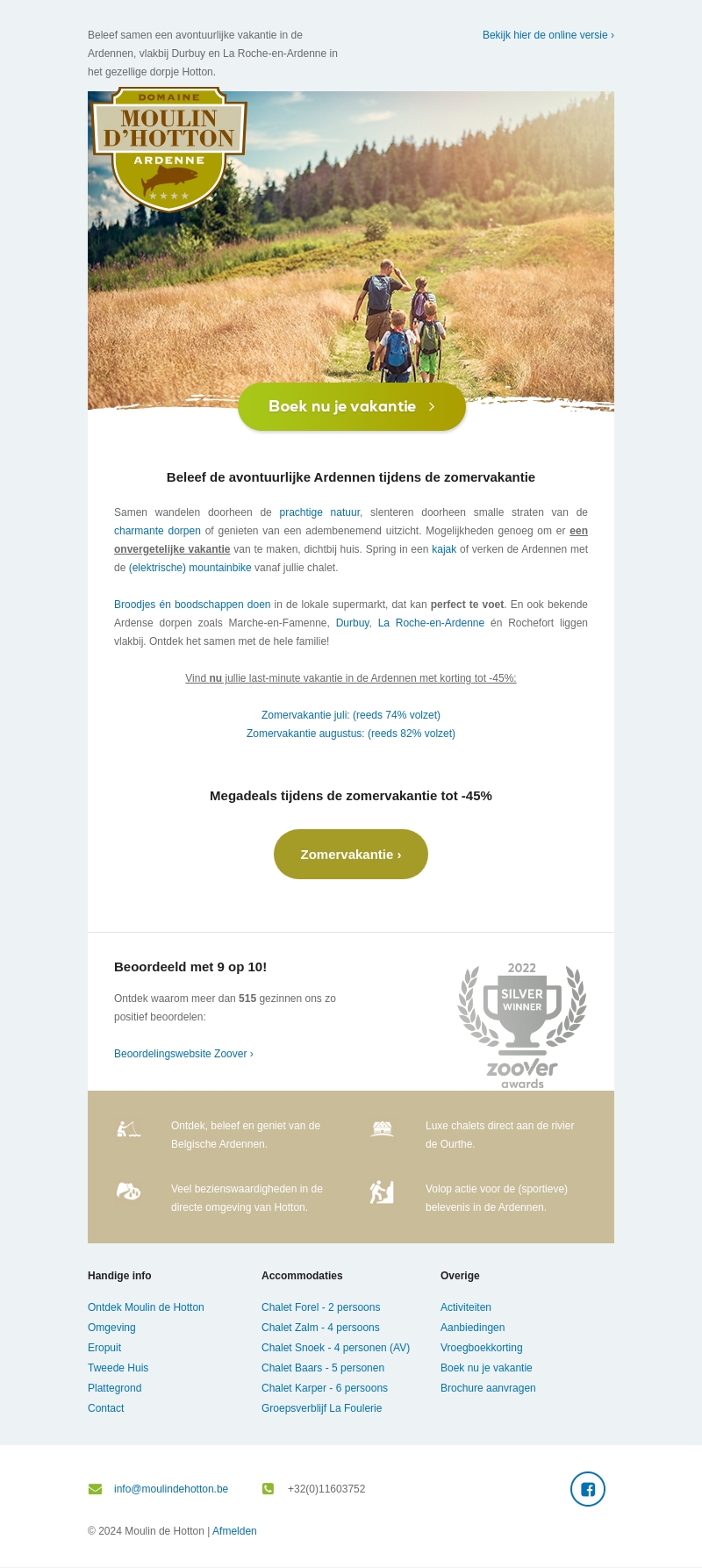 Beleef deze zomer een onvergetelijke vakantie in de Ardennen. Geniet van de natuur, wandel door charmante dorpen en profiteer van megadeals tot -45%. Last-minutes voor juli en augustus zijn bijna weg, dus boek snel! Verken ook de omgeving met activiteiten zoals kajakken en mountainbiken.
